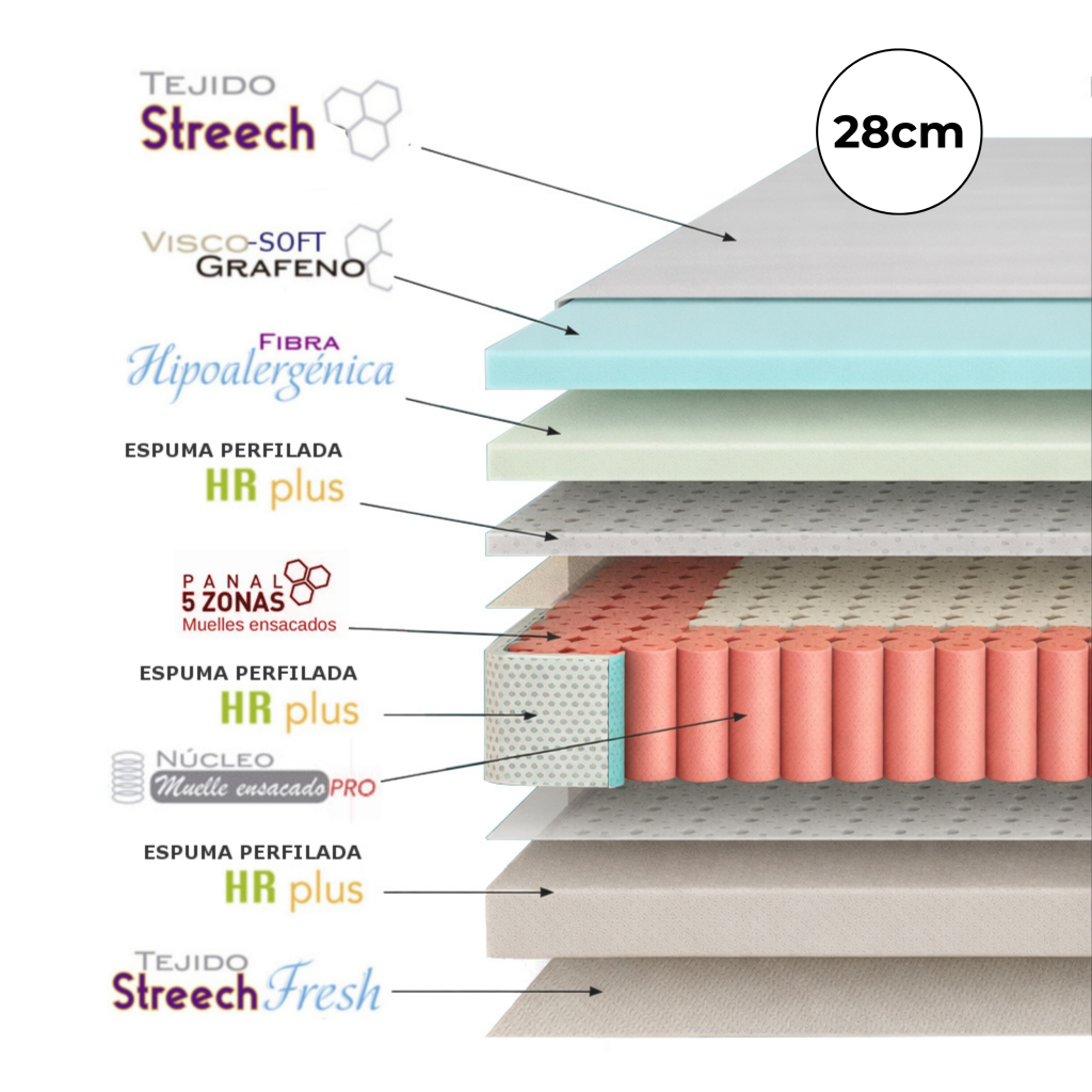 Está fabricado combinando un núcleo de MUELLES ENSCADOS de alta calidad, que asegura la firmeza del colchón, y unas capas de Viscoelástica y Supersoft que amortiguan y proporciona el llamado efecto nube. Además, dicho núcleo garantiza la independencia de lechos y permite que dos personas descansen sobre el colchón sin afectar a la adaptabilidad y firmeza de cada lecho.