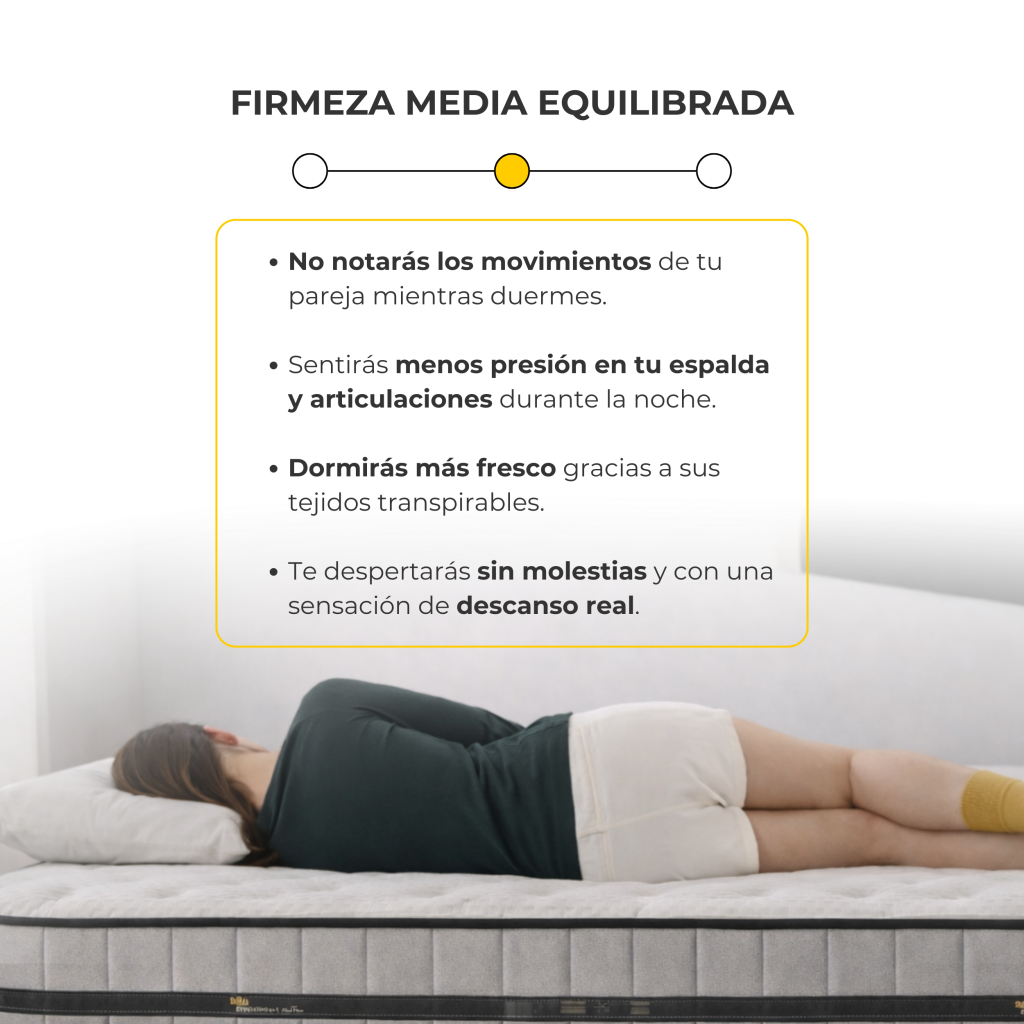 El colchón es firme con multizonas de descanso que unido a la adaptabilidad del núcleo más la confortabilidad del Supersoft, crean un descanso perfecto.